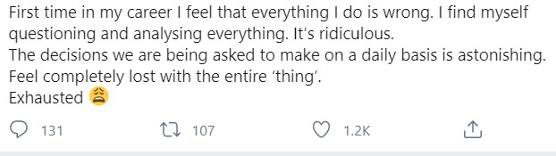 Scientists refer to the practice of hiding how we really feel as ‘surface acting: hiding’. It is correlated with lower job satisfaction, poorer wellbeing and greater likelihood of burnout than other methods of dealing with incongruity. A random scan of twitter on June 15th bears this out. Although in the public domain, I have removed the authors’ names.